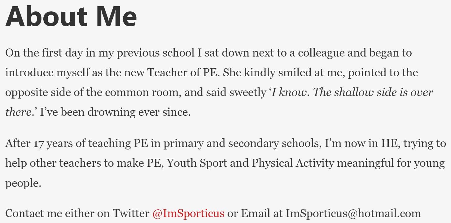 I just could not say anything but... Woah.... What a wonderful and impact short story that implies how other teachers think about PE teachers. Rather than explaining what the blog title means, he shared his critical experience.