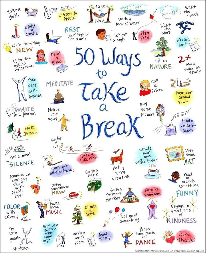 The picture below includes 50 ways to take a break. One thing for sure is there is no scrolling down a small screen. I just wanted to save this picture hoping that I can find it later and use some of those examples. No cell phone. No Instagram. No Youtube. There are many options that I can refer to. Time to get out of the small screen.