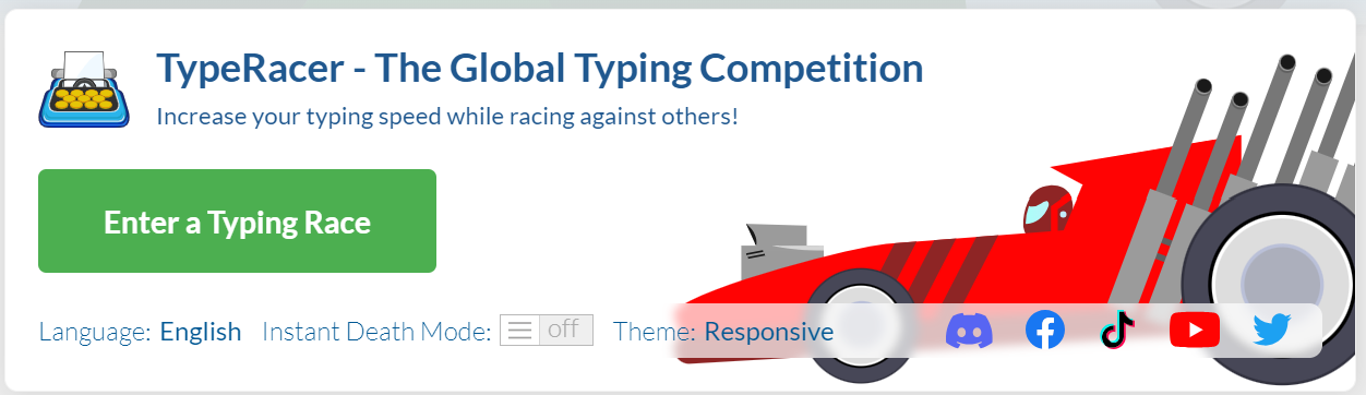 토플을 준비하면서 타자가 느려서 글을 쓰는데 어려움이 있을 수 있다는 글을 읽은 후부터 사용한 타자 연습 사이트. 타자 속도 때문이 아닌 줄은 알고 있었지만, 심심하면 들어가서 하던 게 꽤나 지속됐다. 손가락의 위치를 추천해 주며 연습하게 하는 사이트, 다운로드해서 다양한 기능을 활용할 수 있었던 프로그램, 명언을 지속적으로 반복해서 영어 공부도 같이 할 수 있게 한다는 사이트 등 다양한 타자 연습을 활용해 봤지만 역시나 가장 효과적이었던 건 경쟁을 활용하는 것이었다. 아주 간편하다. 사이트에 들어가자마자 'enter a typing race'를 누르기만 하면 바로 시작된다. 실제 이게 정말 사람인지는 알 수 없지만, 다른 사람들이 타자를 치는 속도를 차로 보여주면서 내가 타자를 칠수록 나의 차가 그들의 차와 경쟁하게 한다. 아주 단순하지만 재밌다. 요즘도 심심하면 들어가서 한 번씩 하곤 한다.