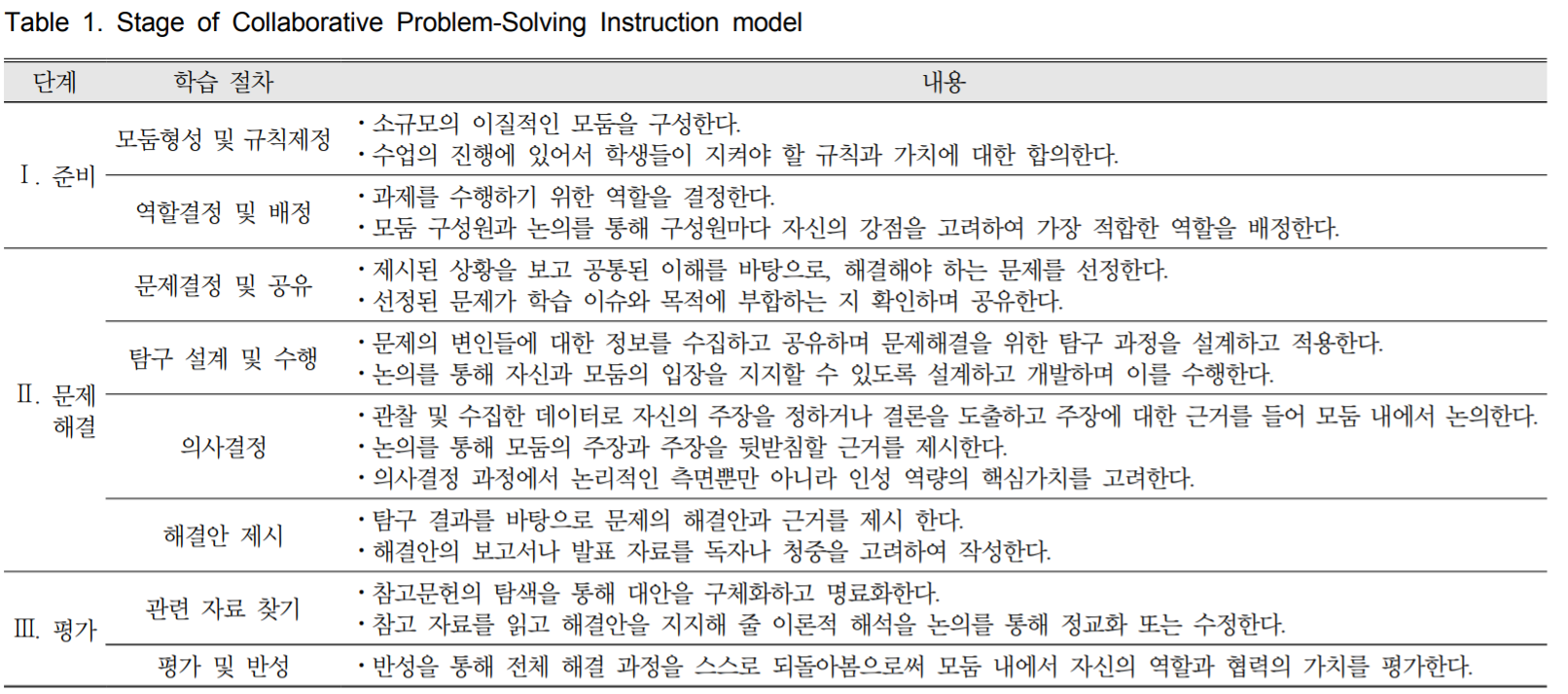 - 방담이. (2020). 협력적 문제해결역량 강화를 위한 융합교육 모델 설계. 학습자중심교과교육연구, 20(15), 1267-1287.