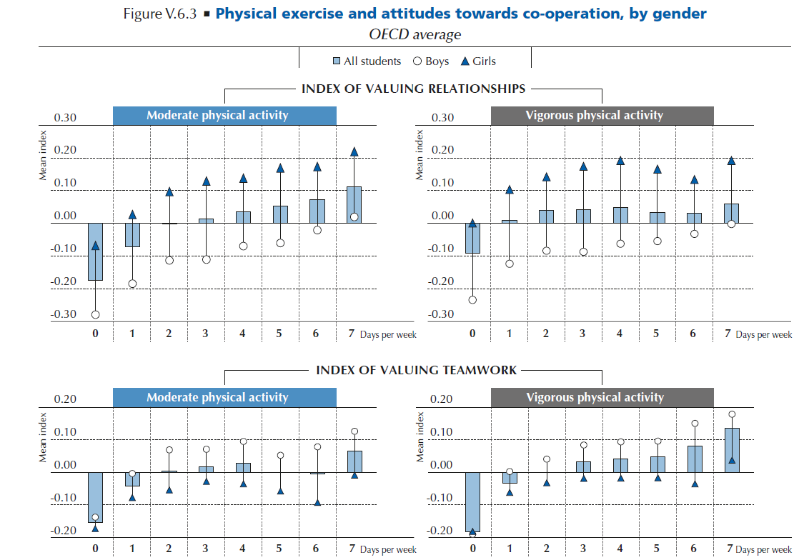 - 하지만 정규 체육수업은 4일 이상 많이 받는 학생보다 1~2일을 받는 학생의 협력적 문제해결 평가가 더 높게 나옴. (Figure V.6.1 / V.6.2 참고)