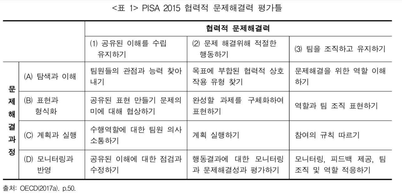 - 특히 2015년 PISA의 3개년 평가에서 협력적 문제해결력을 평가하면서 많은 연구들이 이에 관련한 연구를 내놓음.협력적 문제해결(Collaborative problem solving) 정의