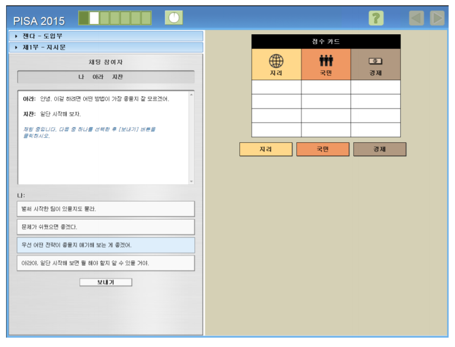 PISA 2015 협력적 문제해결역량 문제 예시 (젠다) - PISA 2015 협력적 문제해결력 결과는 OECD 참여국 중 2∼5 위, 전체 참여국 중 3∼7위로 최상위 수준의 성취를 보임(OECD, 2017a, p.41)