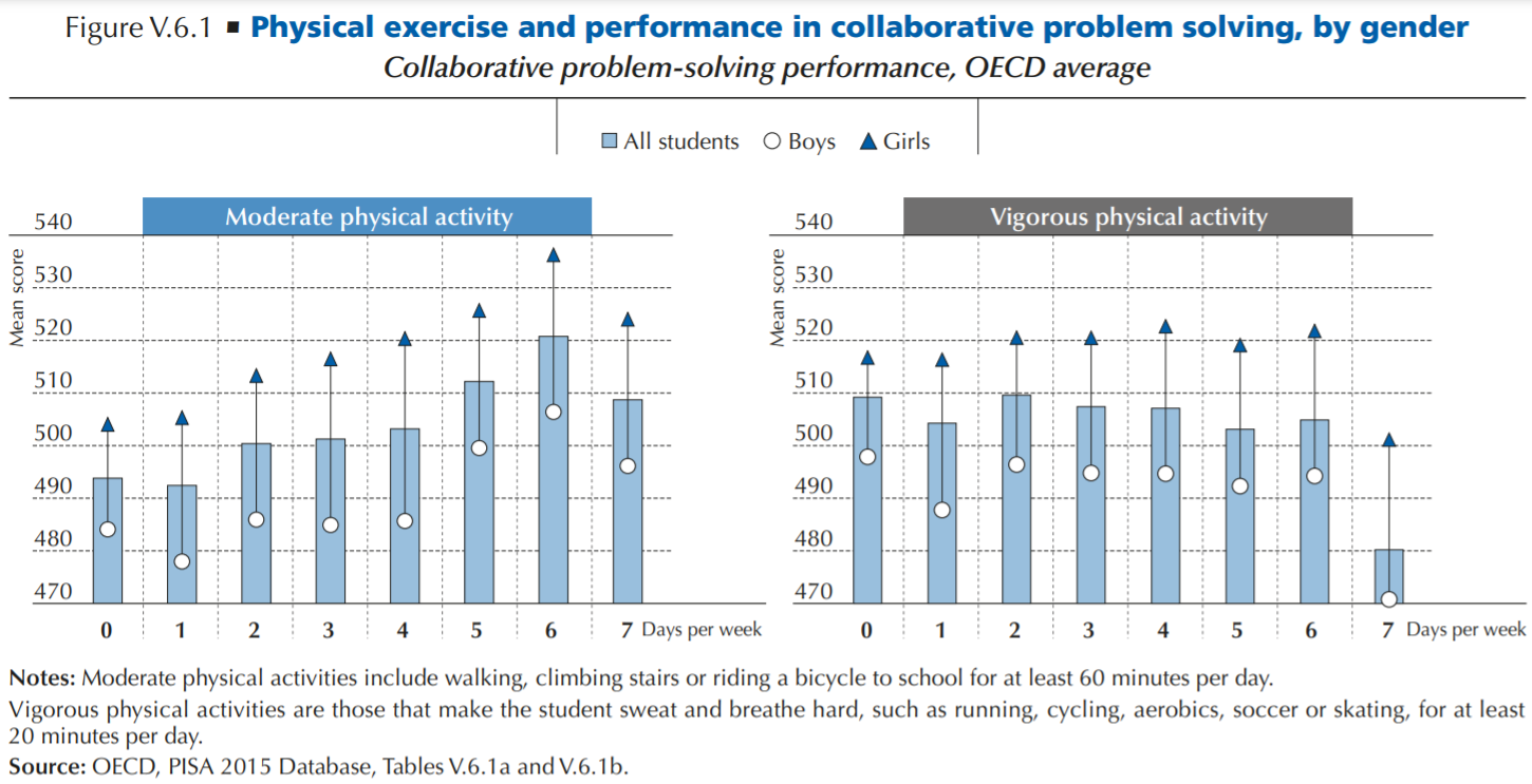 - 2일 이상 중강도 신체활동 참여 학생은 2일 이하 참여 학생보다 협력적 문제해결 평가에서 더 높은 점수를 받음.
